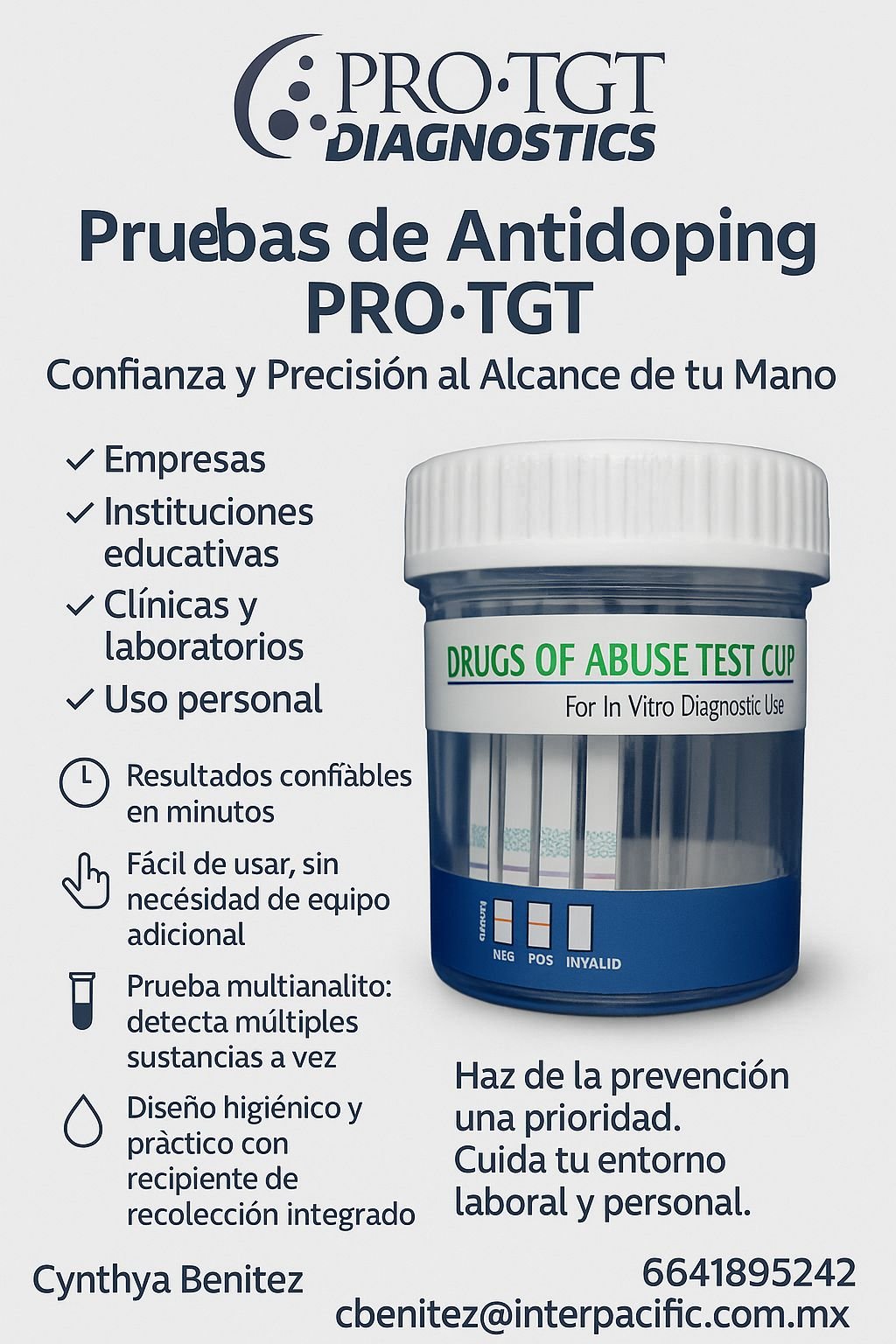 Mi nombre es Cynthya Benitez, asesora de la línea PROTGT, especializada en pruebas rápidas de antidoping. Somos distribuidores directos de fábrica y nos encantaría colaborar con ustedes brindando una solución efectiva, sencilla y confiable para el control de sustancias. Nuestras pruebas ofrecen: • Resultados en solo 5 minutos • Aplicación sencilla y sin equipo especializado • Excelente relación calidad-precio Quedo a tu disposición para brindarte más información, cotización sin compromiso o una muestra demostrativa. Celular – WhatsApp: (664) 189-52-42 WhatsApp directo: Haz clic aquí […]